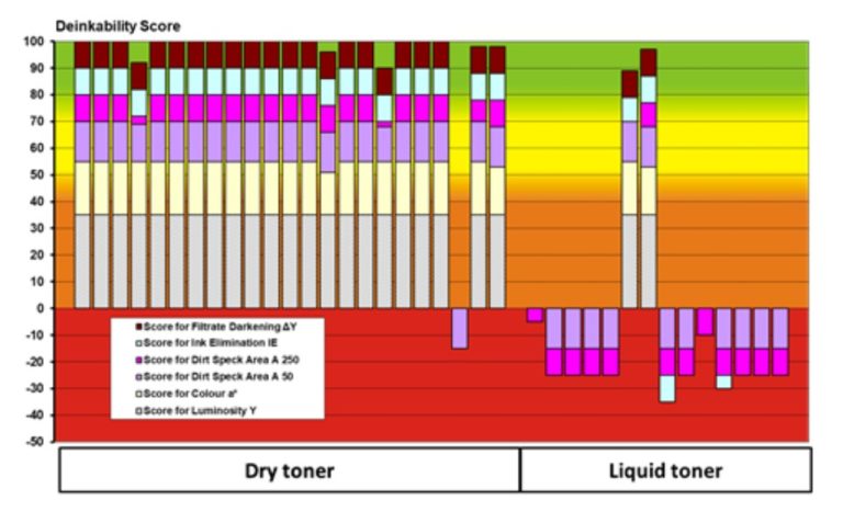 Após a impressão, fixação e repolpação, os tamanhos das partículas de toner seco variam de 25 µm a 250 µm.4 Suas impressões são geralmente bem destintáveis. A parte esquerda da Figura 1 mostra que, com uma exceção, todas as outras impressões de toner seco alcançam a avaliação de destintabilidade "boa". A exceção é uma impressão com uma combinação incomum de toner e substrato.