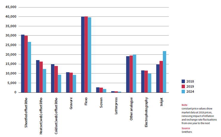 A Figura 2 mostra a produção em milhões de euros da European Printing & Printed Packaging para 2018, 2019 e uma previsão para 2024, com base em preços e taxas de câmbio constantes de 2018, para os diferentes processos de impressão. A flexografia é o maior processo de impressão individual (aproximadamente € 40 bilhões) em 2018 e 2019, à frente do offset plano com aproximadamente € 30 bilhões. A flexografia é contabilizada principalmente para impressão de embalagens e etiquetas, com embalagens de papelão ondulado representando o maior elemento individual. As perspectivas futuras não parecem tão positivas para quase todos os processos de impressão devido à crise da pandemia do coronavírus. Referindo-se aos processos de impressão relevantes para papéis gráficos (offset plano, offset heatset, offset mais frio, rotogravura, eletrofotografia e jato de tinta), a produção em 2019 está somando aproximadamente € 107 bilhões, tendo em mente que pelo menos para alguns dos processos listados as receitas estão relacionadas em parte também à impressão de embalagens. Mas torna-se óbvio que, para produtos de papel gráfico, o offset é o processo de impressão dominante, com uma participação de mercado na Europa em valor de cerca de 57%. A rotogravura atingiu seu pico ligeiramente acima de 20% por volta do ano 2000 e continuou em declínio desde então, atingindo cerca de 16% em 2008 e cerca de 8% em 2019. A razão para isso é a tendência de revistas cada vez mais especializadas, com tiragens menores, o que as torna inviáveis para a produção em rotogravura. Outras tecnologias de impressão, atualmente principalmente processos digitais, como eletrofotografia e impressão a jato de tinta, respondem por uma participação de cerca de 35% do valor.