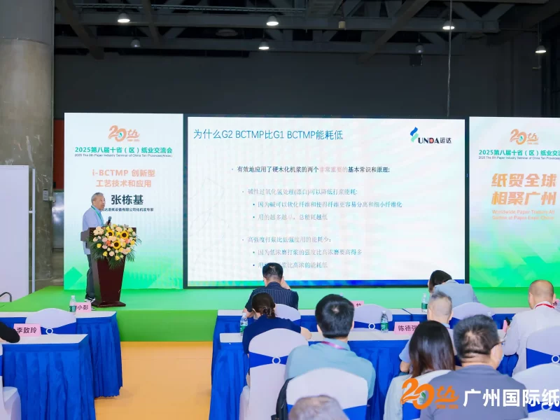 , Zhang Dongji, especialista em celulose da Yunda Chemical Machinery, realizou uma apresentação técnica intitulada "i-BCTMP - Tecnologia de Processo Inovadora e Aplicações" para mais de 300 representantes e profissionais da indústria papeleira e seus setores upstream e downstream.