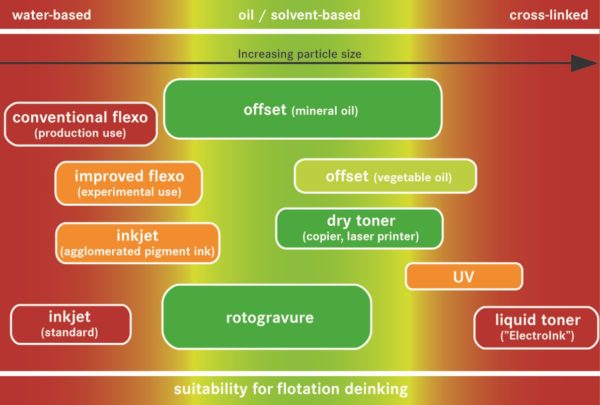O tamanho das partículas do filme de tinta fragmentado após a repolpação, bem como a hidrofobicidade das partículas, dependem fortemente dos componentes da tinta, do mecanismo de secagem e, até certo ponto, da interação entre a tinta e o substrato. Os componentes básicos das tintas de impressão utilizadas nos processos convencionais de impressão offset, flexográfica e rotogravura são veículos de tinta, corantes (pigmentos ou corantes de tinta), aditivos como agentes de secagem e outros componentes. O veículo funciona como um carreador (por exemplo, solventes) e como um aglutinante (por exemplo, resinas). O processo de impressão e os requisitos da impressora determinam a seleção dos componentes e suas proporções. A Tabela 1 mostra a composição das tintas de impressão convencionais relevantes para a destintagem.