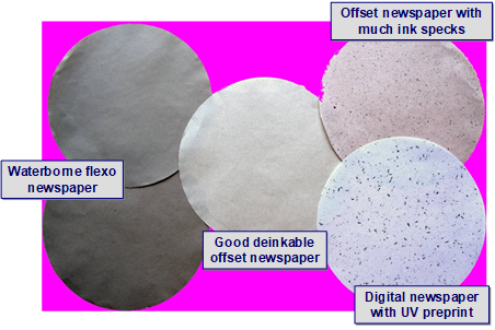 A Figura 2 mostra algumas folhas de papel de polpa destintada para demonstrar diferentes resultados de destintagem. À esquerda, exemplos de jornal flexográfico à base de água; no centro, um bom jornal offset destintável com tintas à base de óleo mineral; à direita, em cima, um jornal offset à base de óleo vegetal com muitas manchas de tinta; e, embaixo, um jornal impresso digitalmente em papel sem madeira com pré-impressão curada por UV.