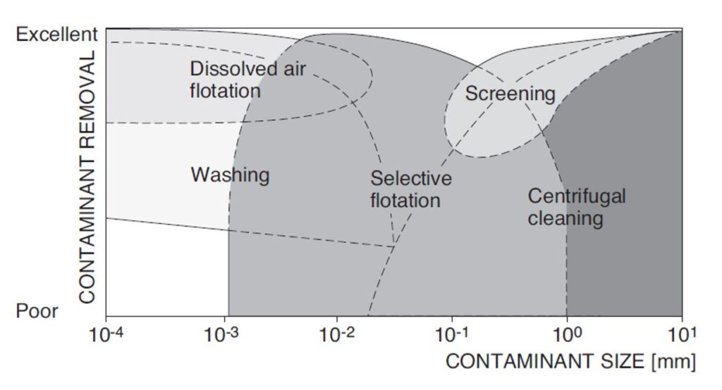 A Figura 1 mostra a dispersão de eficiência de vários processos de separação versus o tamanho das partículas de detritos. A eficiência de separação dos limpadores é excelente em tamanhos de partículas grandes, se sua densidade diferir suficientemente daquela da água e das fibras umedecidas. Caso contrário, o efeito de separação pode diminuir quase para zero.